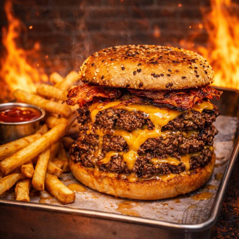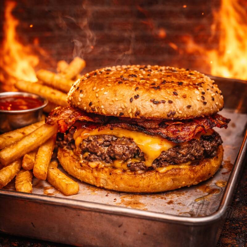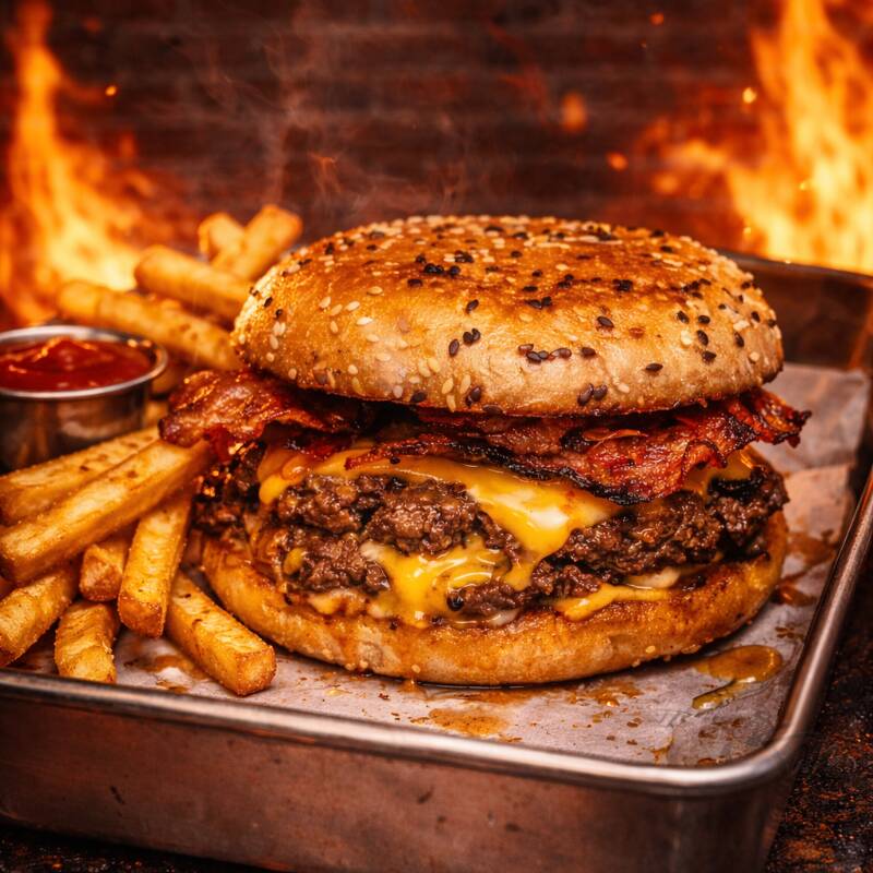 "¡El Smash que tu día necesita! 🔥 Borde crocante, centro jugoso y mucho queso. No es solo una hamburguesa, es una experiencia adictiva en cada bocado. 🥓🧀 ¡Pídela ya antes de que se acaben!"