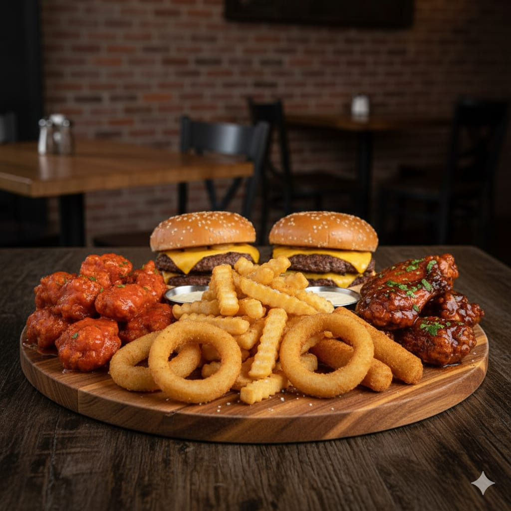 El Smash Full Sampler es el festín definitivo! Este combo masivo incluye una porción de jugosos boneless, alitas crujientes, dos hamburguesas Smash Single, cinco aros de cebolla doraditos y tres dedos de queso mozzarella fundido.
