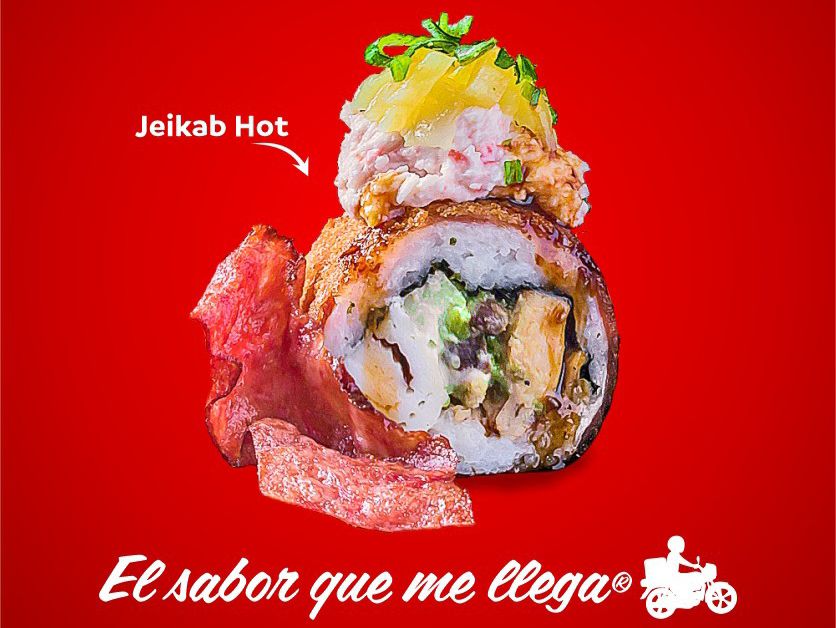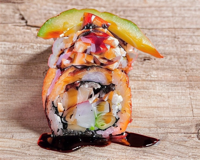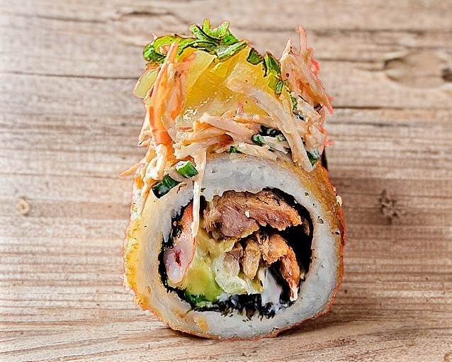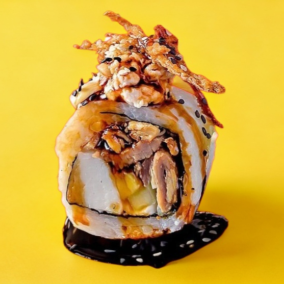 Dentro: res pollo y tocino. Fuera: coronado con nuestra deliciosa pasta vity, chile caribe y cebollín bañado en salsa de anguila.
