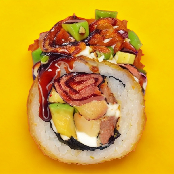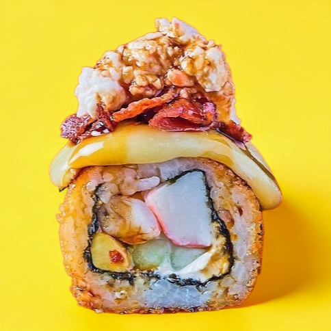 Una deliciosa combinación de philadelphia, res, pollo, camarón capeado y queso americano sobre una exquisita cama de arroz con queso chihuahua, tampico, aguacate y salsa de anguila.
