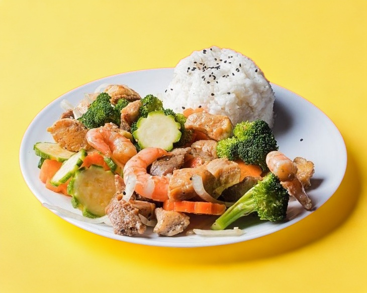 Delicioso guiso de res, pollo, camarón, zanahoria, brócoli, calabaza, cebolla, chile poblano, acompañado de arroz blanco.
