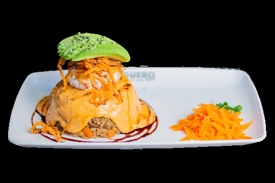 Arroz blanco relleno de camarones a la diabla y philadelphia, horneado con quesos y coronado con tampíco, aguacate y salsa de anguila.