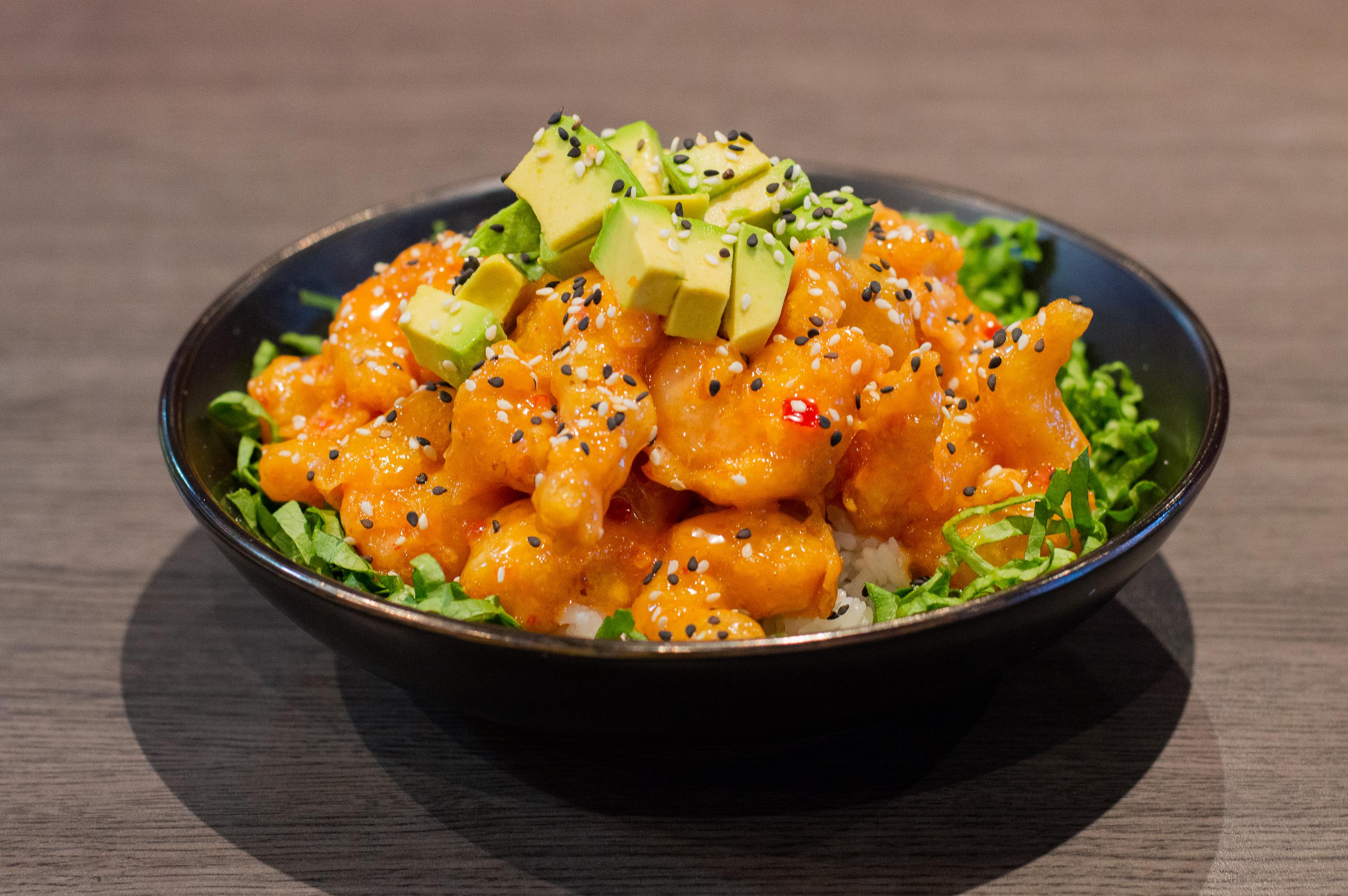Un clásico de sabor, crujientes camarones empanizados en capeado Roca, montado sobre una cama de arroz blanco y lechuga fresca, bañados con aderezo spicy roca y coronado con cubos de aguacate, toda una belleza de sabor.110 g. de Camarón.