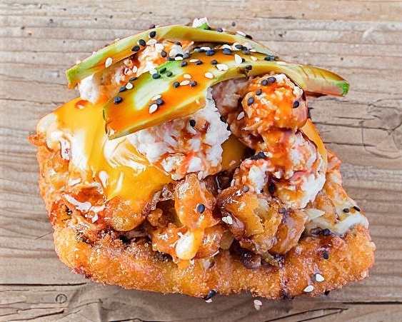 Cama de arroz empanizado, res, pollo, queso amarillo, tampíco, aguacate y salsa de anguila.