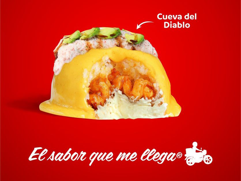 Dentro: res pollo y tocino. Fuera: nuestra rica y deliciosa pasta chili cream coronado con pasta crunch, cubos de aguacate y crujientes tiras de tocino, bañado en salsa de anguila.