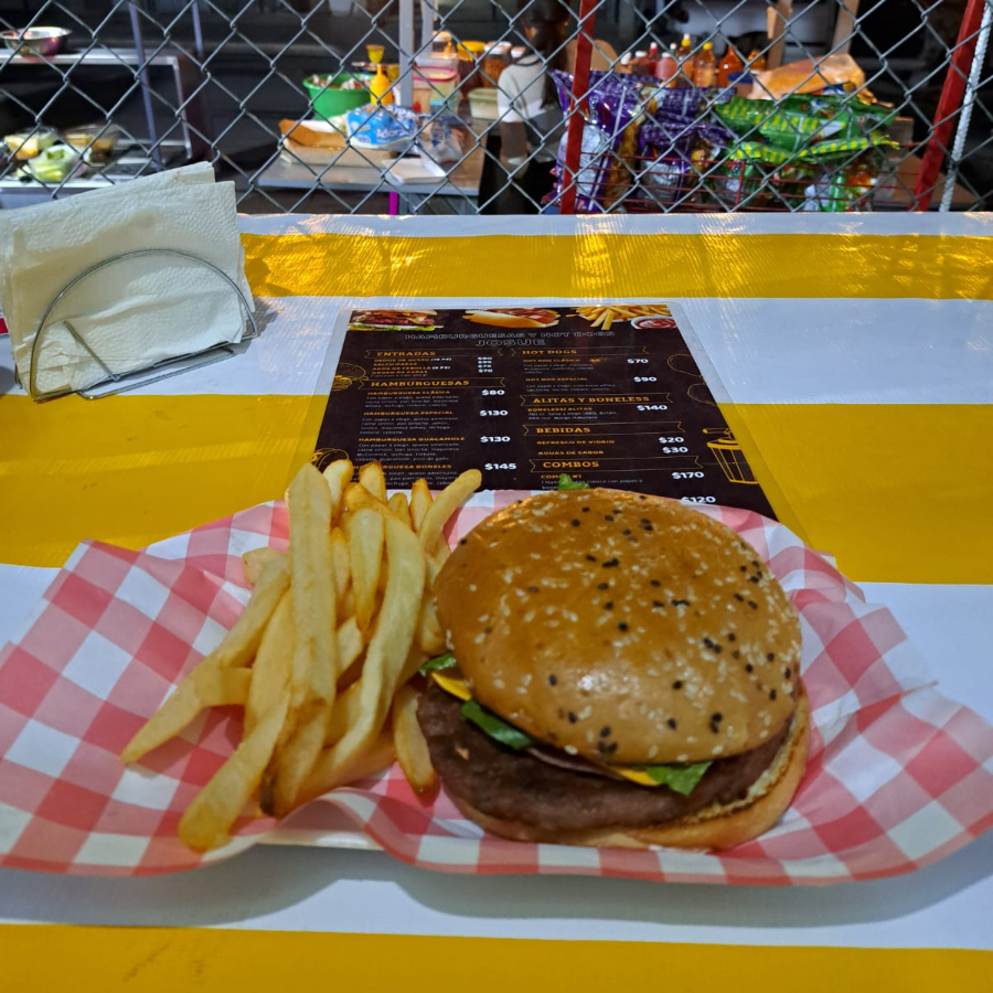 Con papas a elegir, queso americano, carne sirloin, pan parrilleros, mayonesa McCormick, lechuga, tomate y cebolla.
