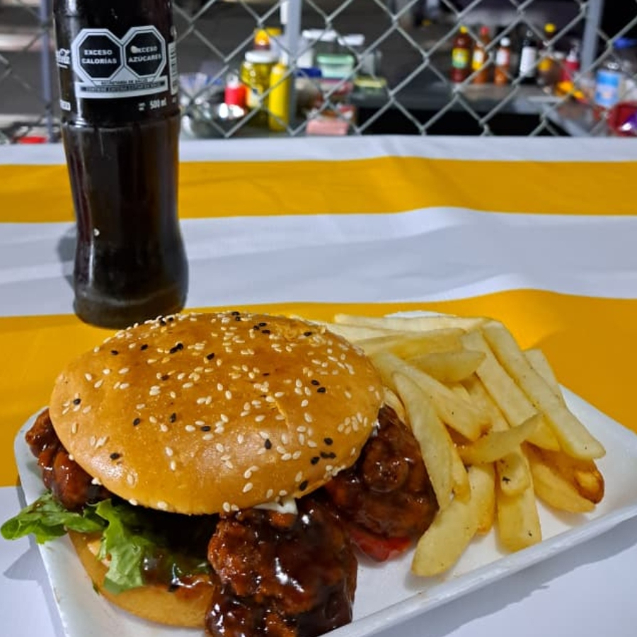 Con papas a elegir, queso americano, doble carne sirloin, pan parrilleros, mayonesa McCormick, lechuga, tomate y cebolla.