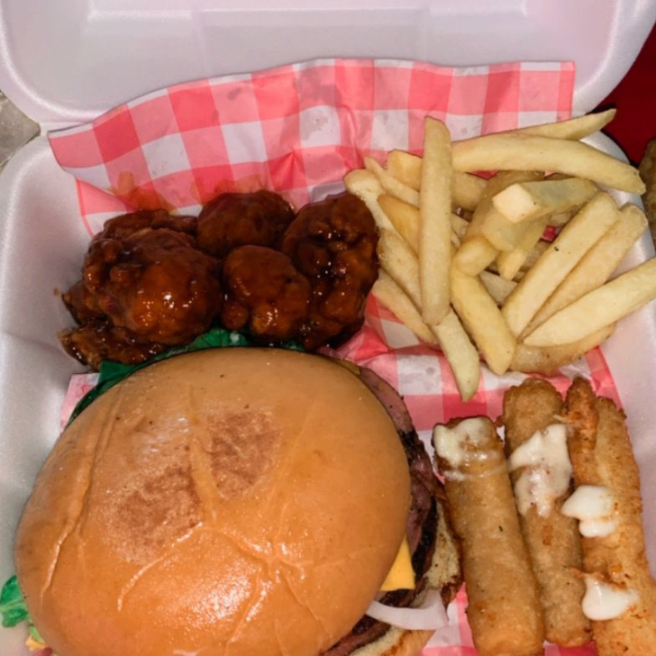 1 Hamburguesa clásica con papas y boneless, 3 dedos de queso.