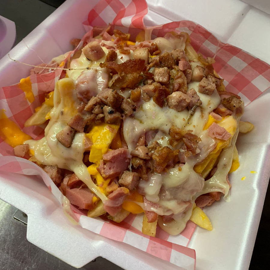 Con papas a elegir, mayonesa McCormick, salchicha, tomate, cebolla, boneless y papas.