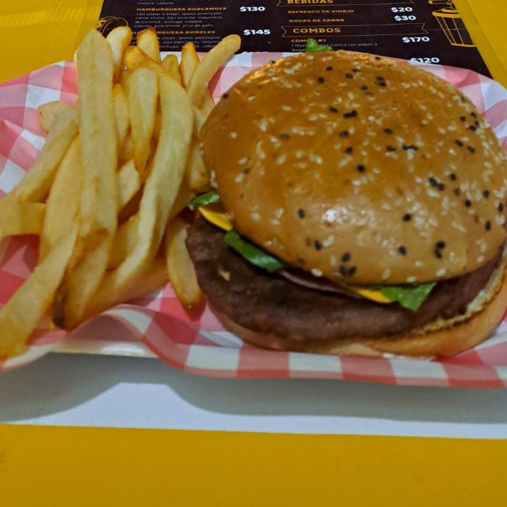 Con papas a elegir, queso americano, carne sirloin, pan brioche, mayonesa wilsey, lechuga, tomate, cebolla, boneless y papas.