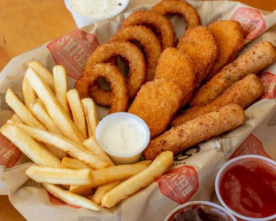 5 pz de aros de cebolla, 4 pz de nuggets de pollo, 3 pz de dedos de queso gouda, acompañados de vegetales y 1 oz de aderezo ranch
