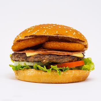 Carne de res, queso, jamón y aros de cebolla incluye papas fritas