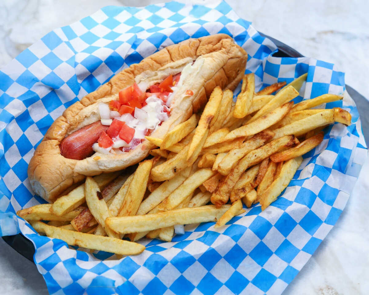 Salchicha de pavo envuelta en tocino, tomate, cebolla y mayonesa. Acompañado de papas fritas naturales.