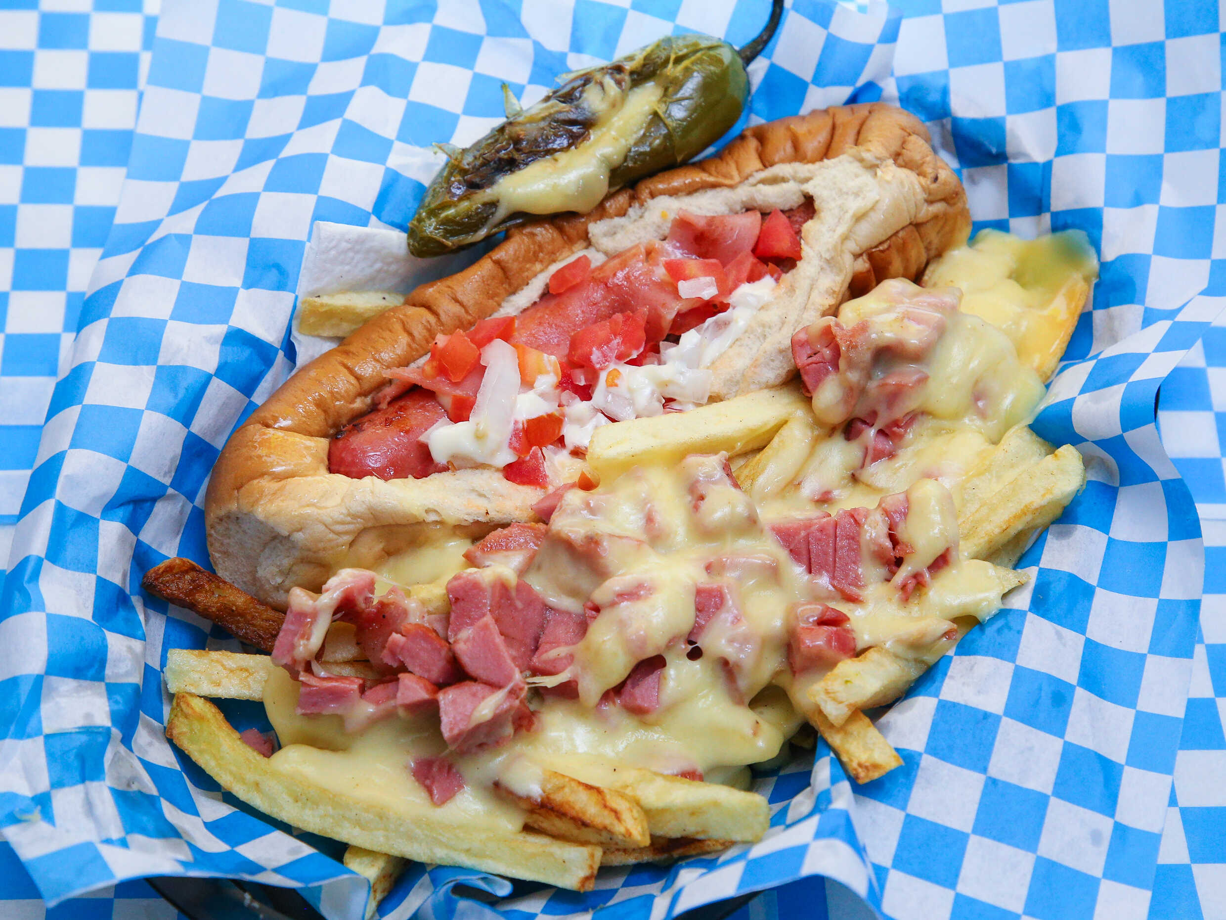 Salchicha de pavo envuelta en tocino, jamón y queso americano o chihuahua, tomate, cebolla y mayonesa. Acompañado de papas fritas naturales.
