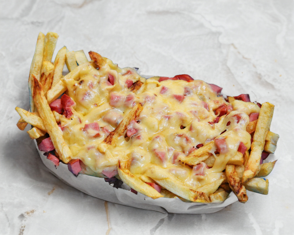 Papas naturales fritas con salchicha de pavo picada y gratinadas en queso chihuahua.