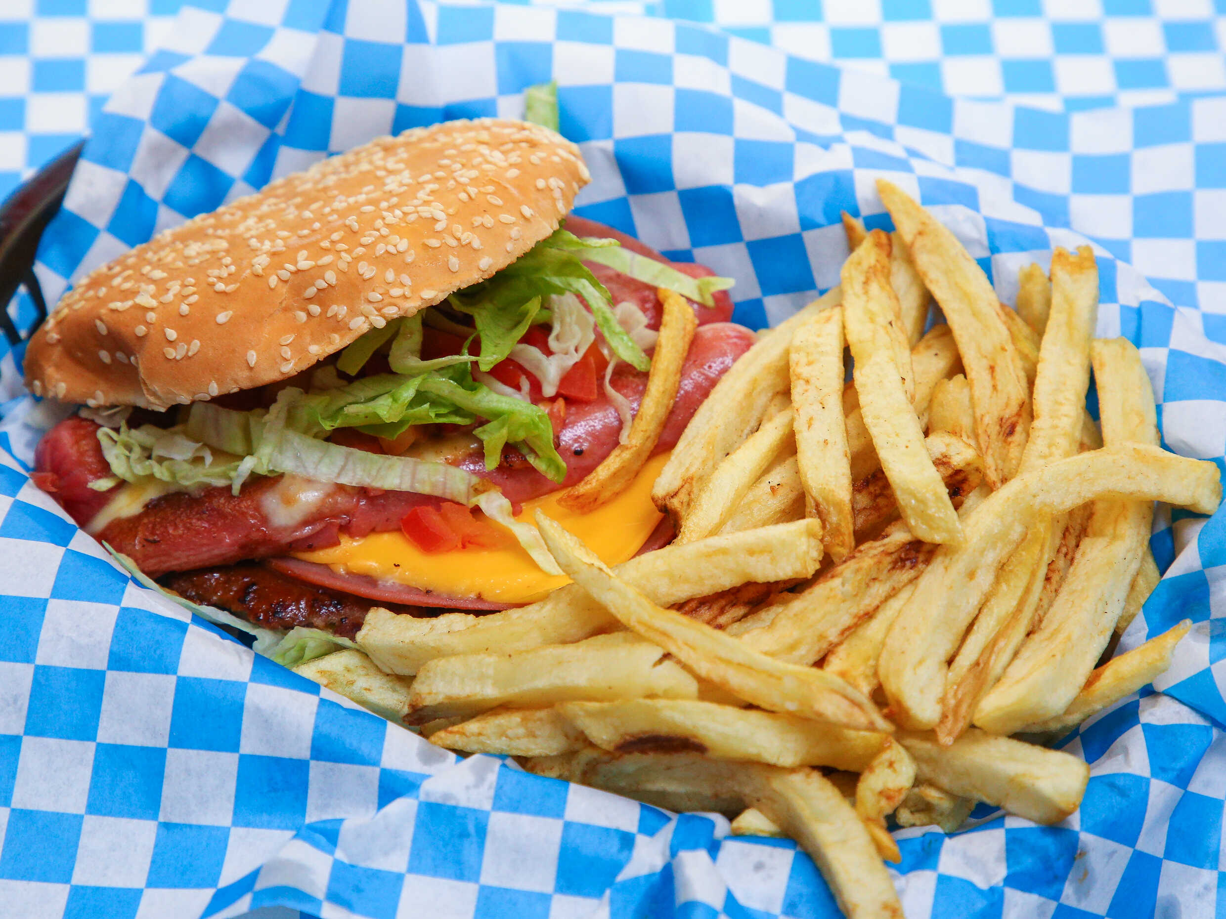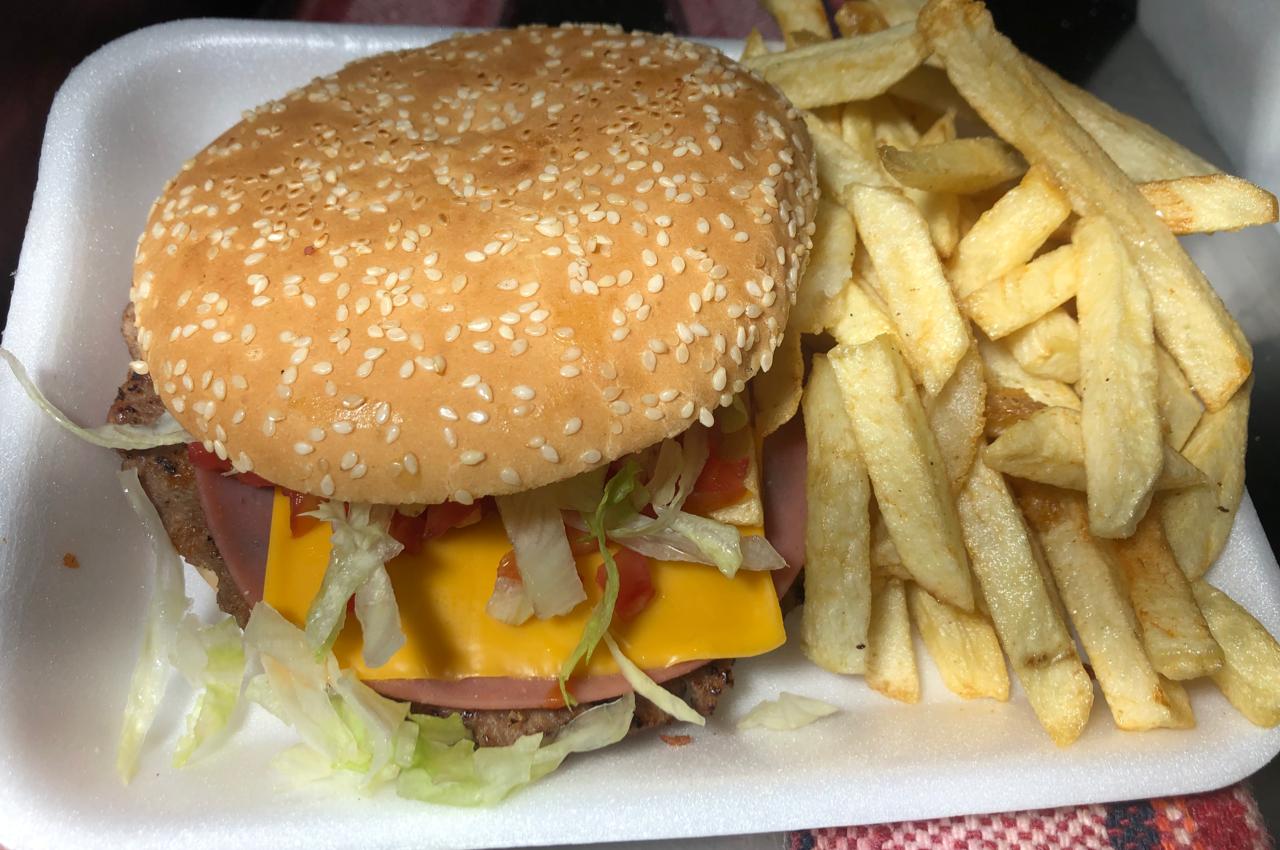 Carne de res preparada con receta de la casa, jamón, queso americano, tomate, cebolla, lechuga y mayonesa. Acompañada de papas fritas naturales.