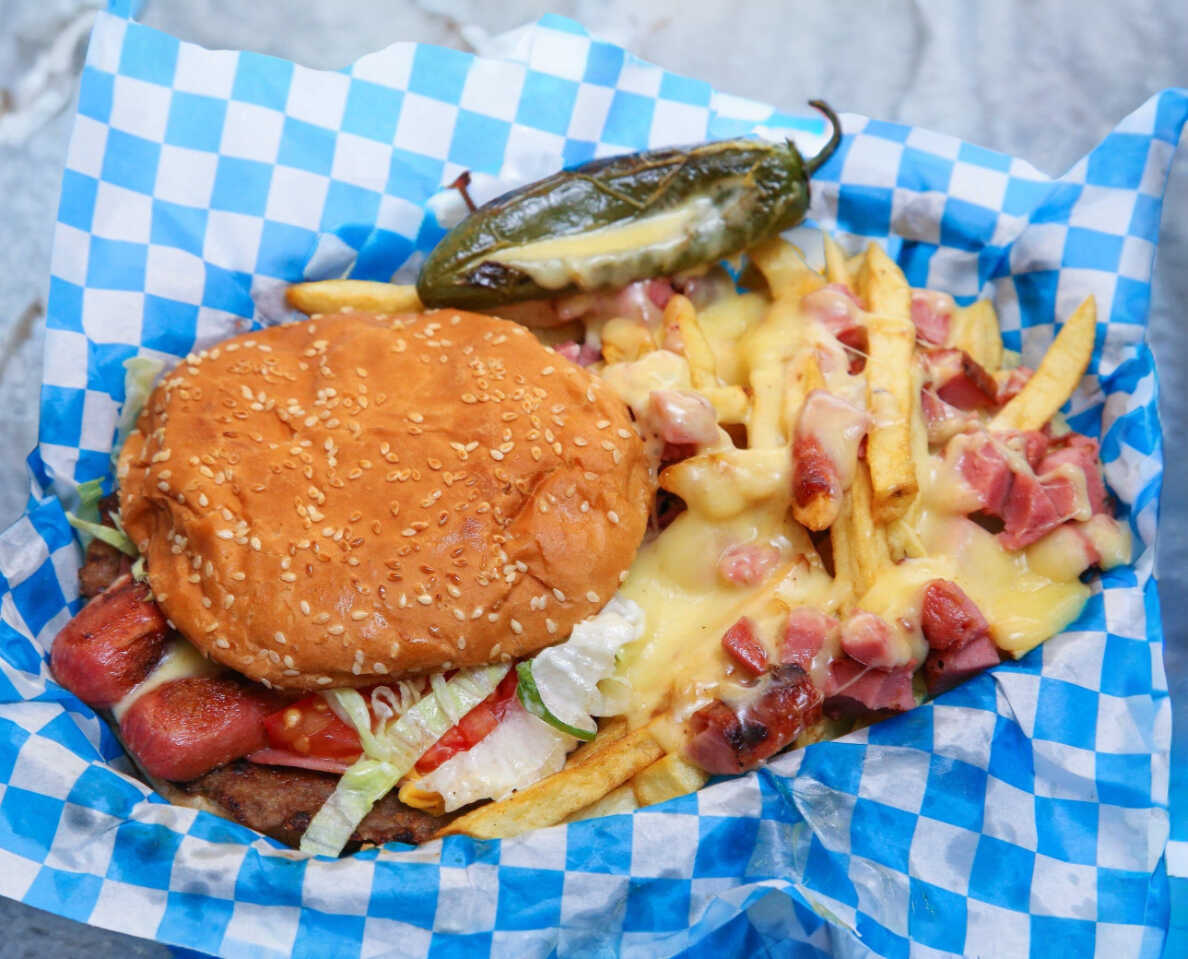 Carne de res preparada con receta de la casa, jamón, queso americano, salchicha, queso chihuahua, tomate, cebolla, lechuga y mayonesa. Acompañada de papas fritas naturales y salchichas gratinadas con queso chihuahua.