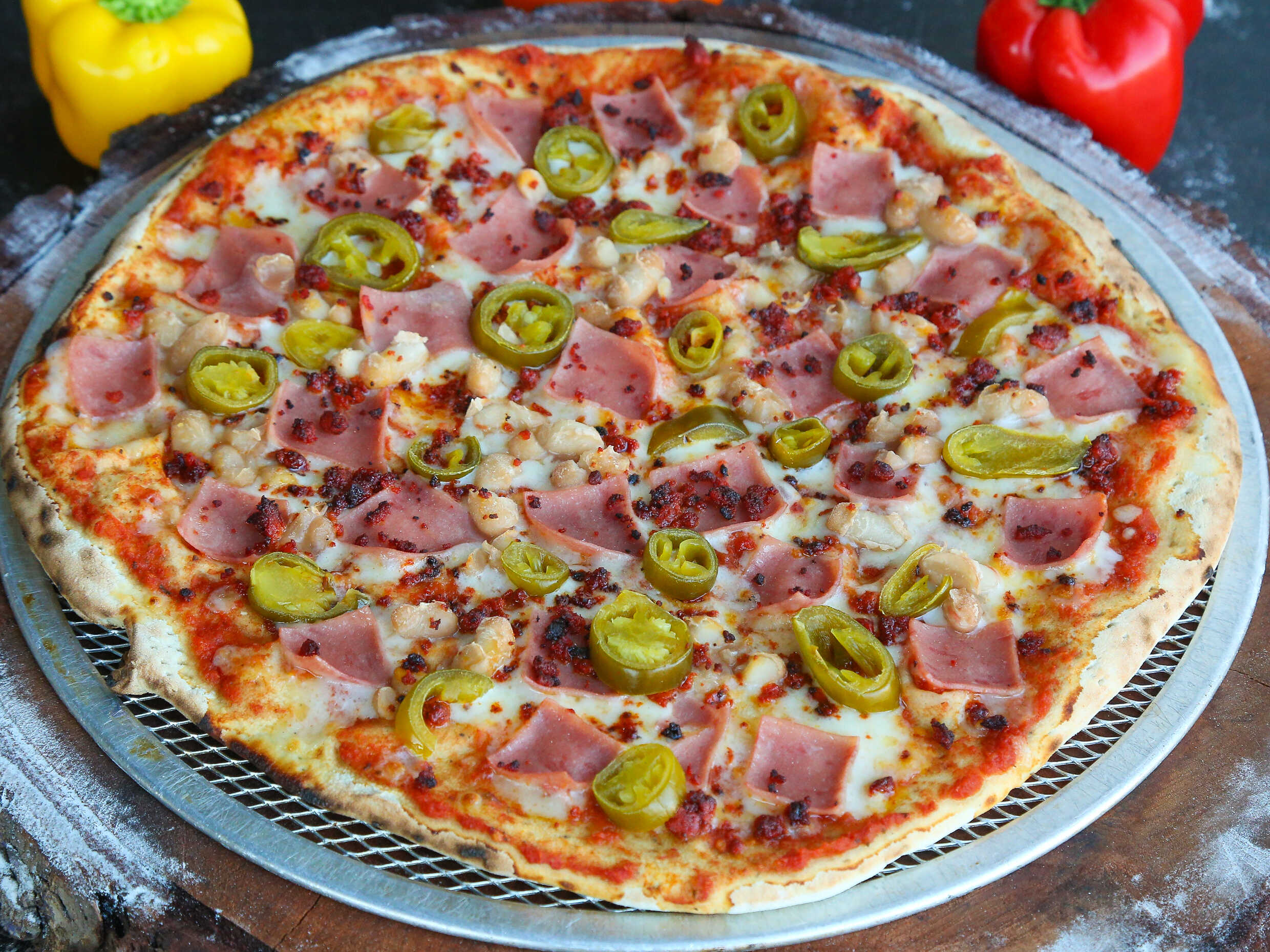 pizza a la leña de 8pzs (jamon, chorizo, frjol, jalapeño)