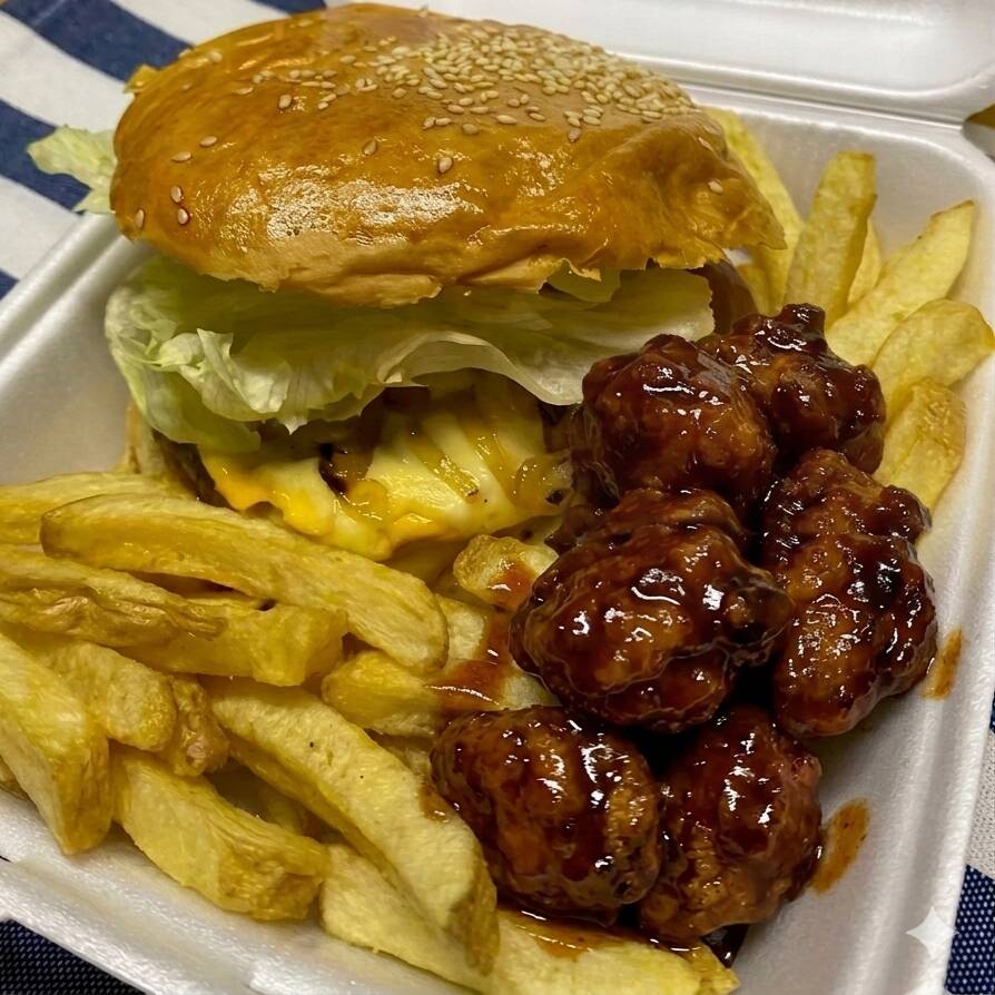 Hamburguesa especial acompañada de papas naturales, media orden de boneless (6) y una bebida a elegir