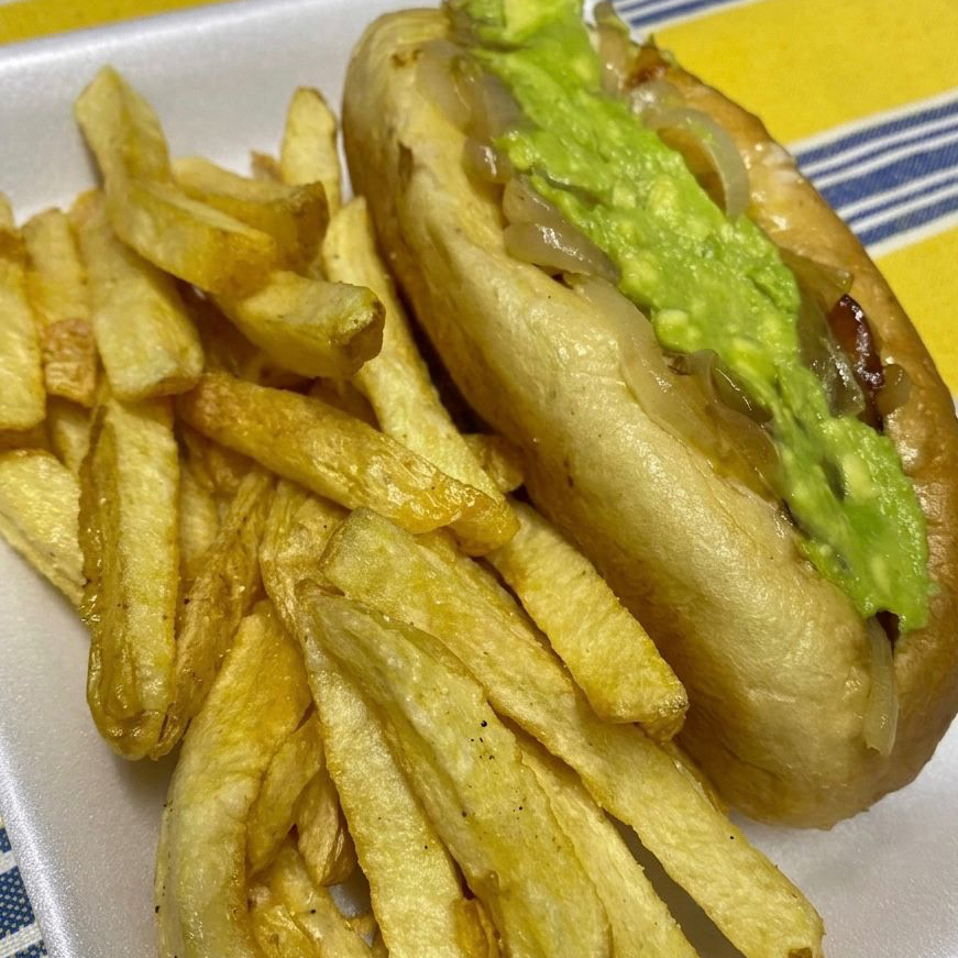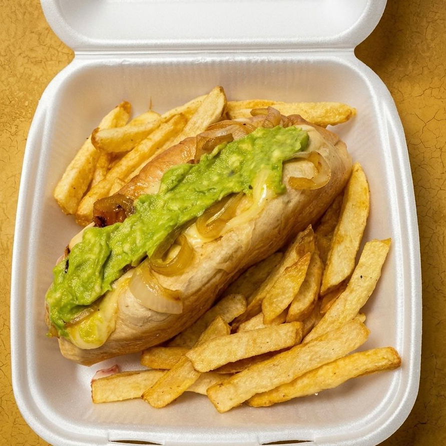 Salchicha envuelta en tocino, jamón queso amarillo y gratinado con queso chihuahua, tomate, cebolla caramelizada y guacamole