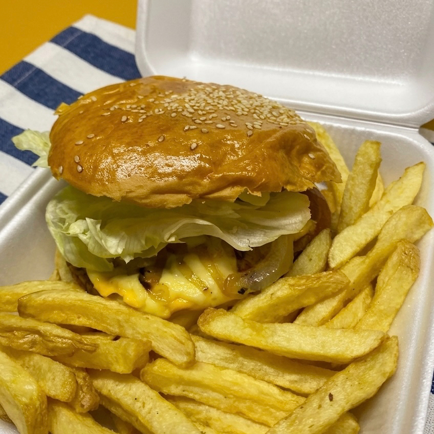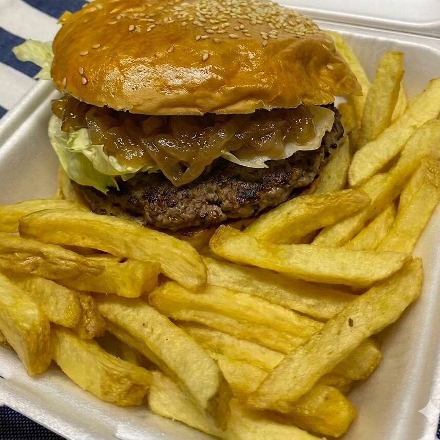 Hamburguesa sencilla con carne, lechuga, tomate y cebollita caramelizada acompañada de papas naturales