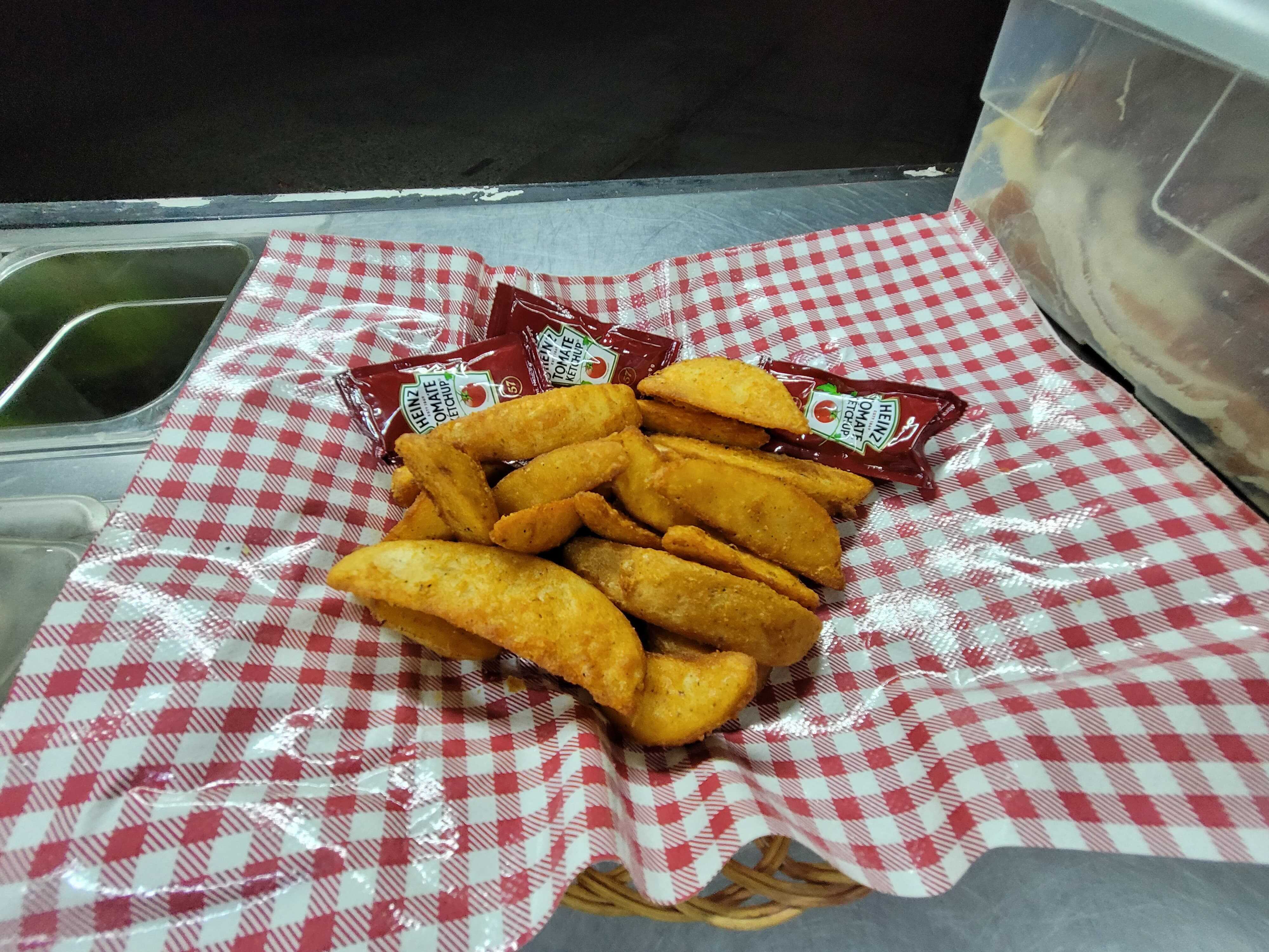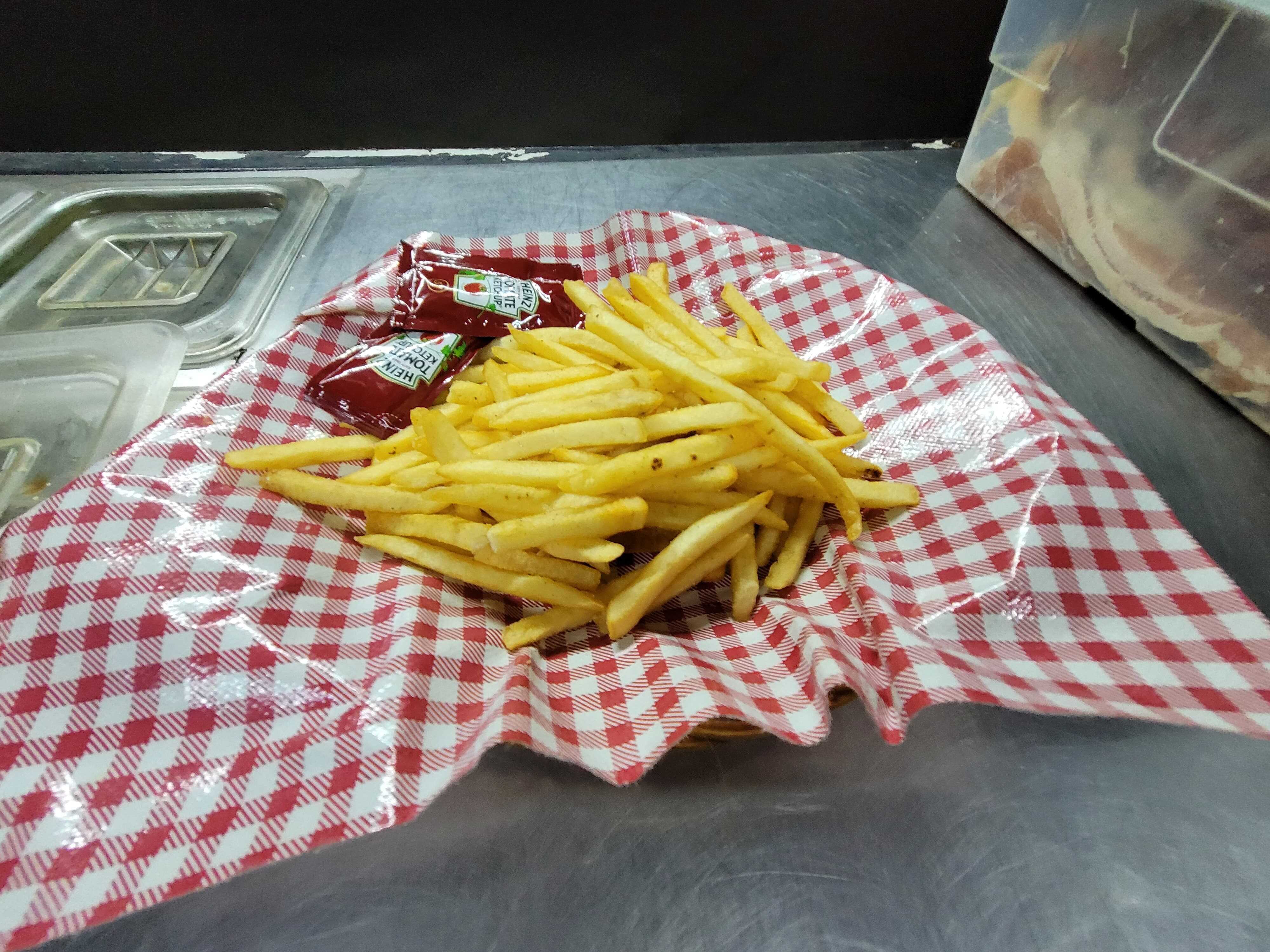 Cama de papas a la francesa, con dos salchichas de pavo envueltas en tocino picados, queso, cátsup, aderezo ranch o chipotle.