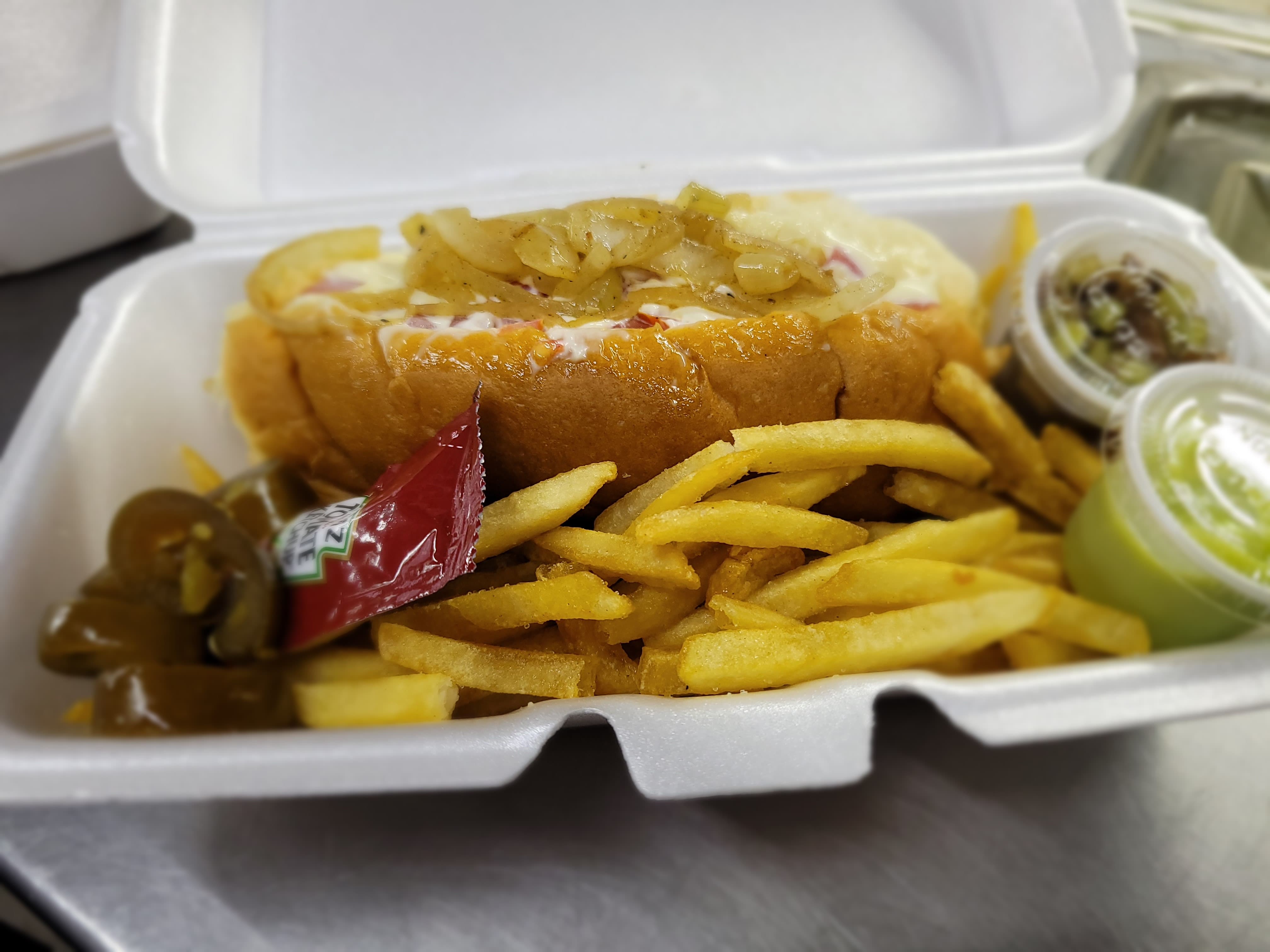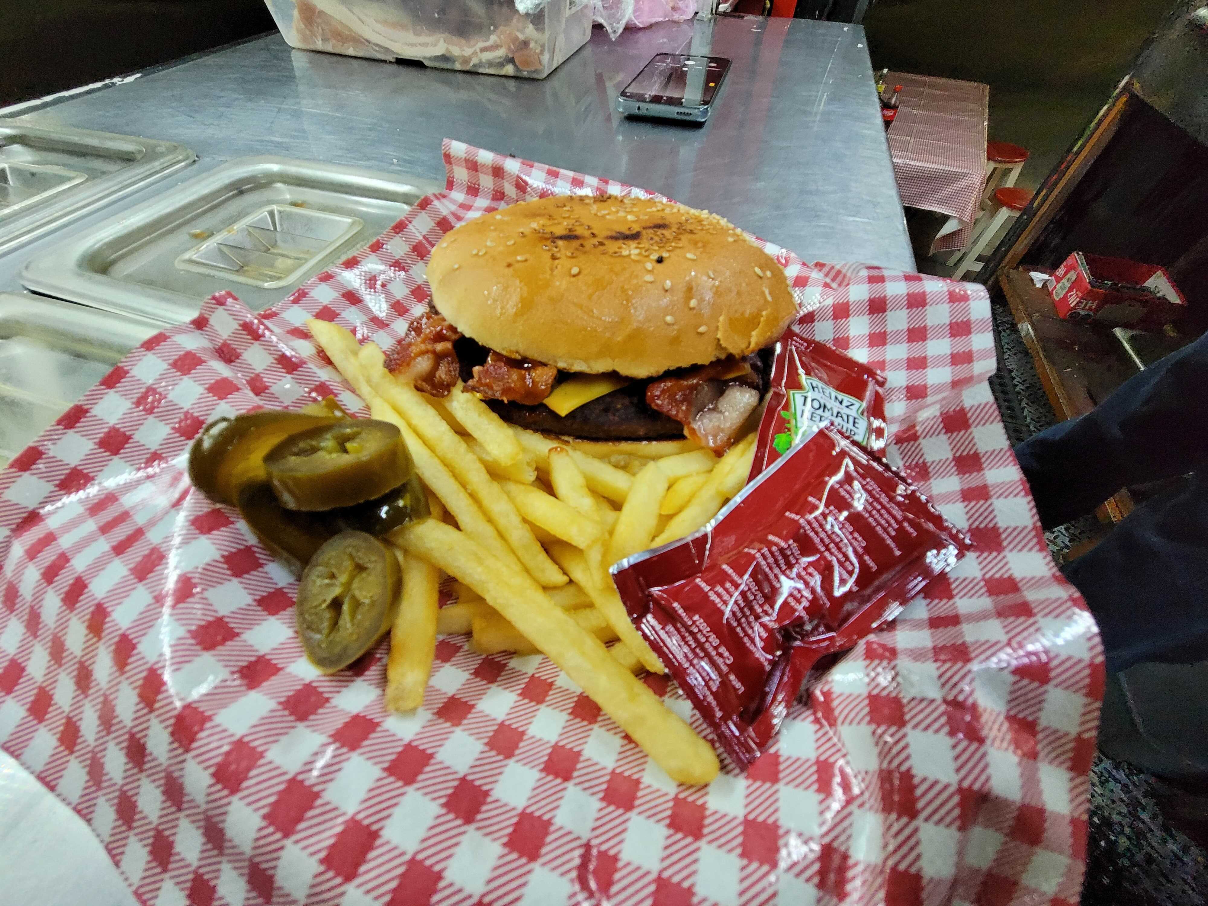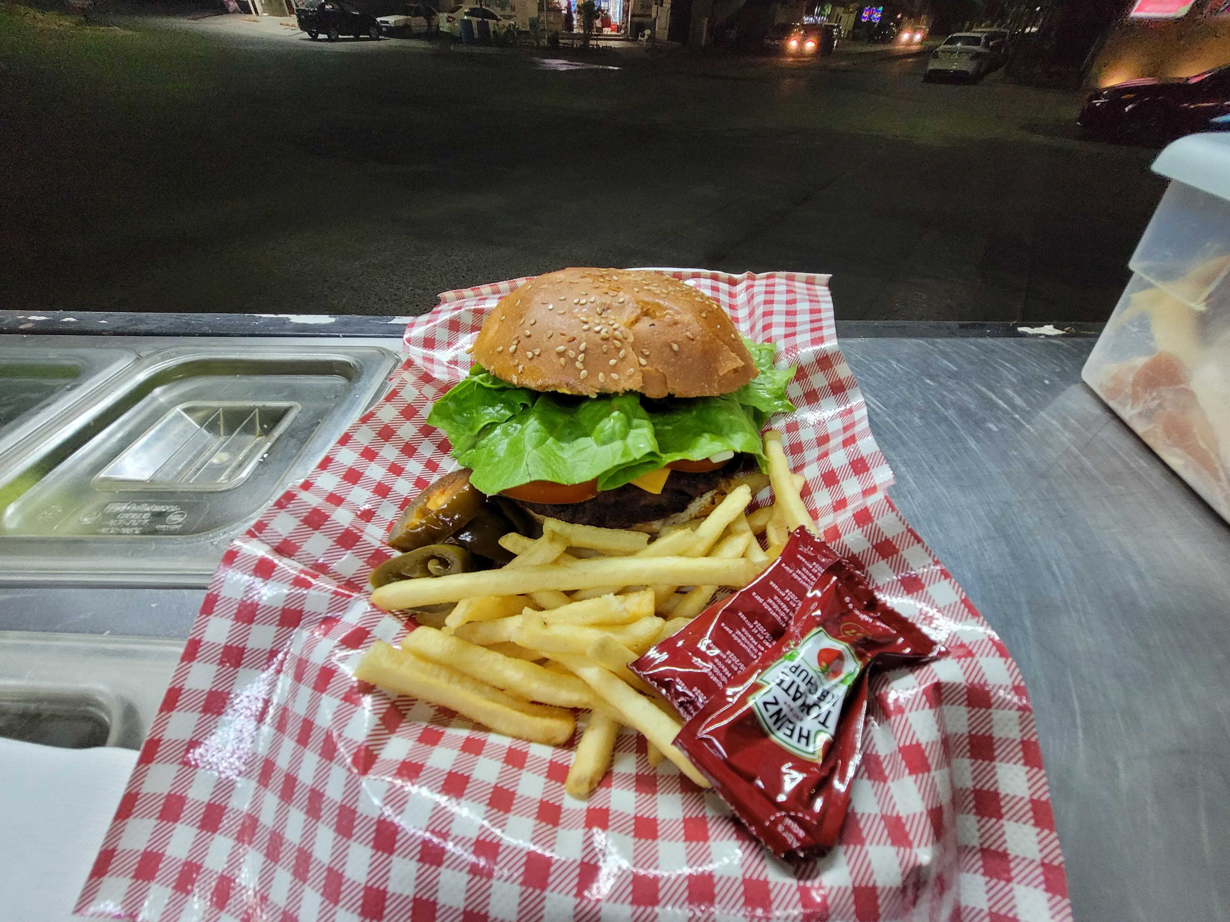Medallón de carne, queso americano, cebolla blanca, tomate, lechuga, pepinillos, mayonesa, mostaza y cátsup. Incluye papas.