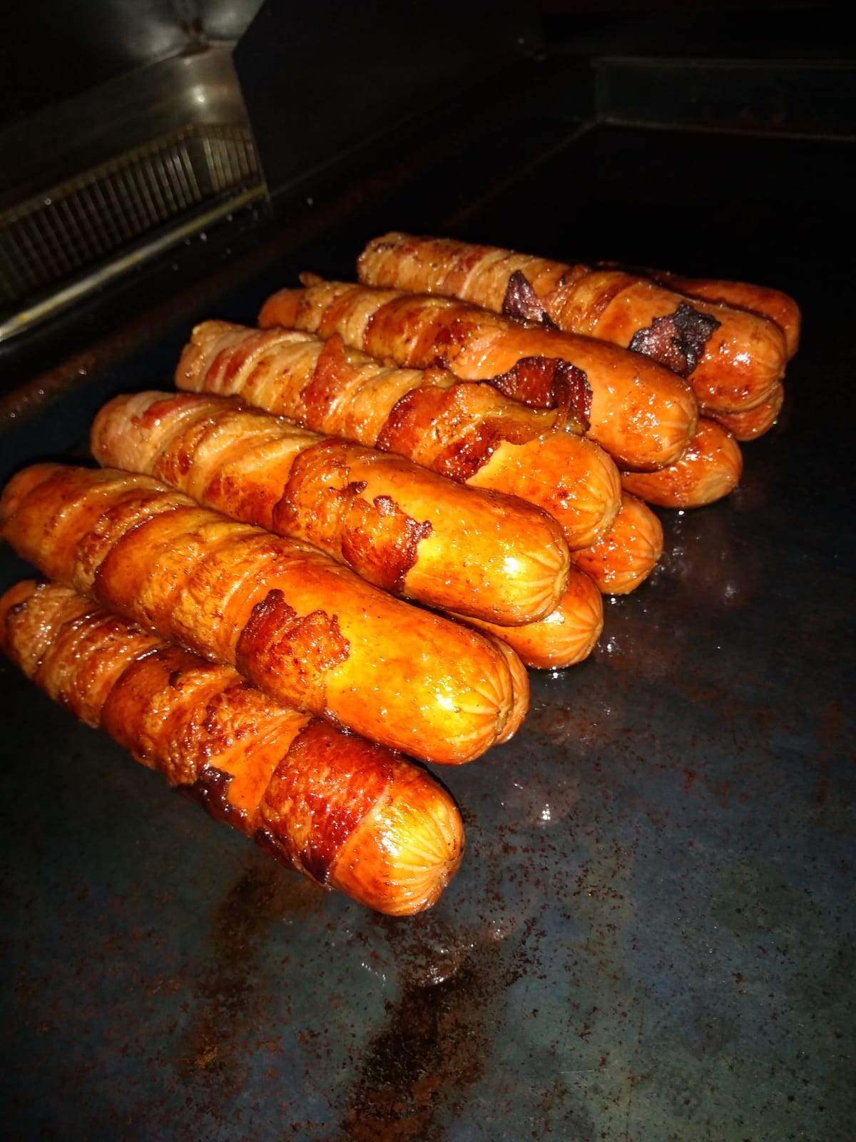Dos salchichas envueltas en tocino picados, mayonesa, mostaza, cátsup, tomate, cebolla cruda y asada.