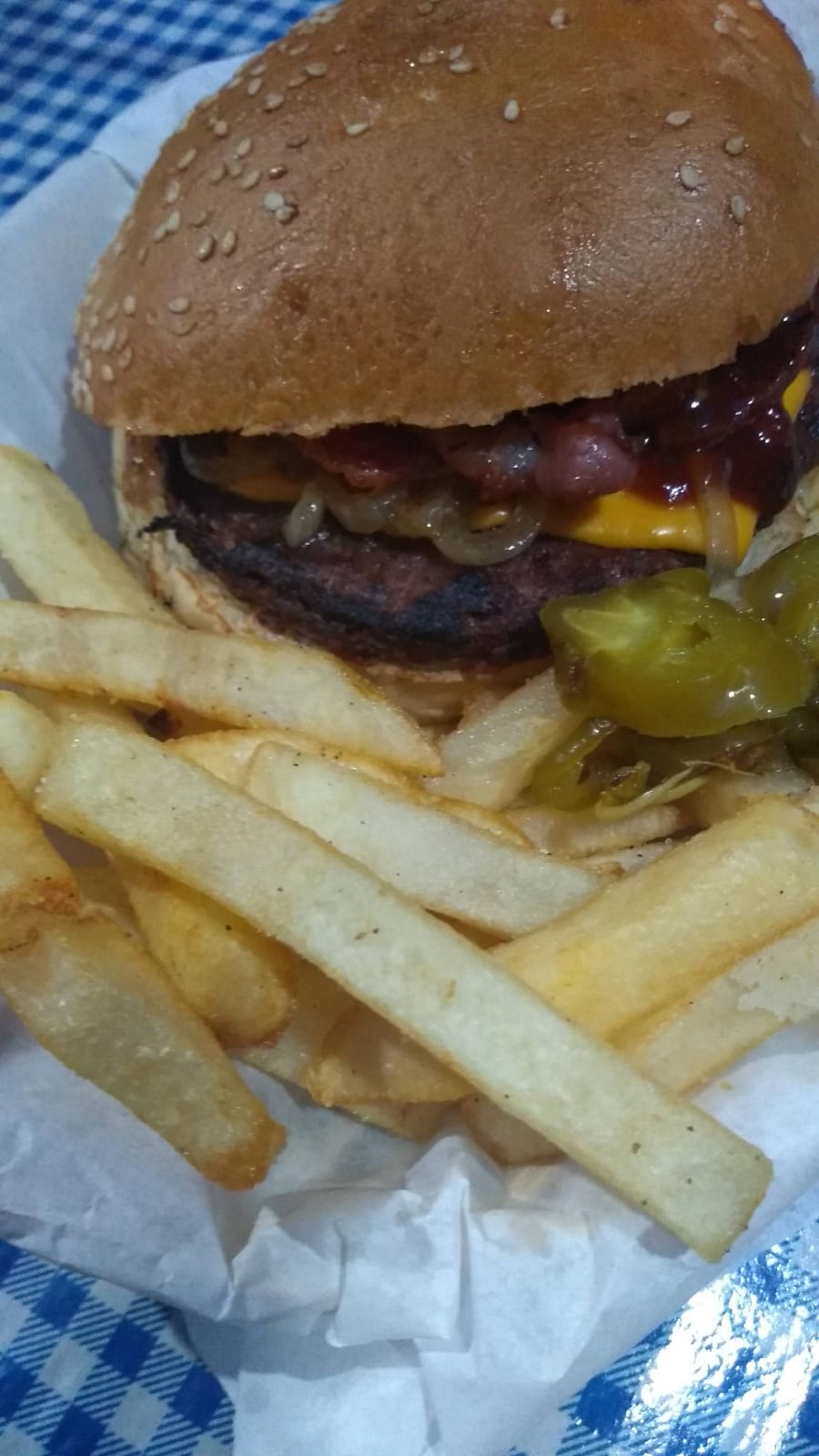 Medallón de carne a elección, queso americano, cebolla asada, tocino, salsa BBQ, mayonesa, mostaza y cátsup. Incluye papas.