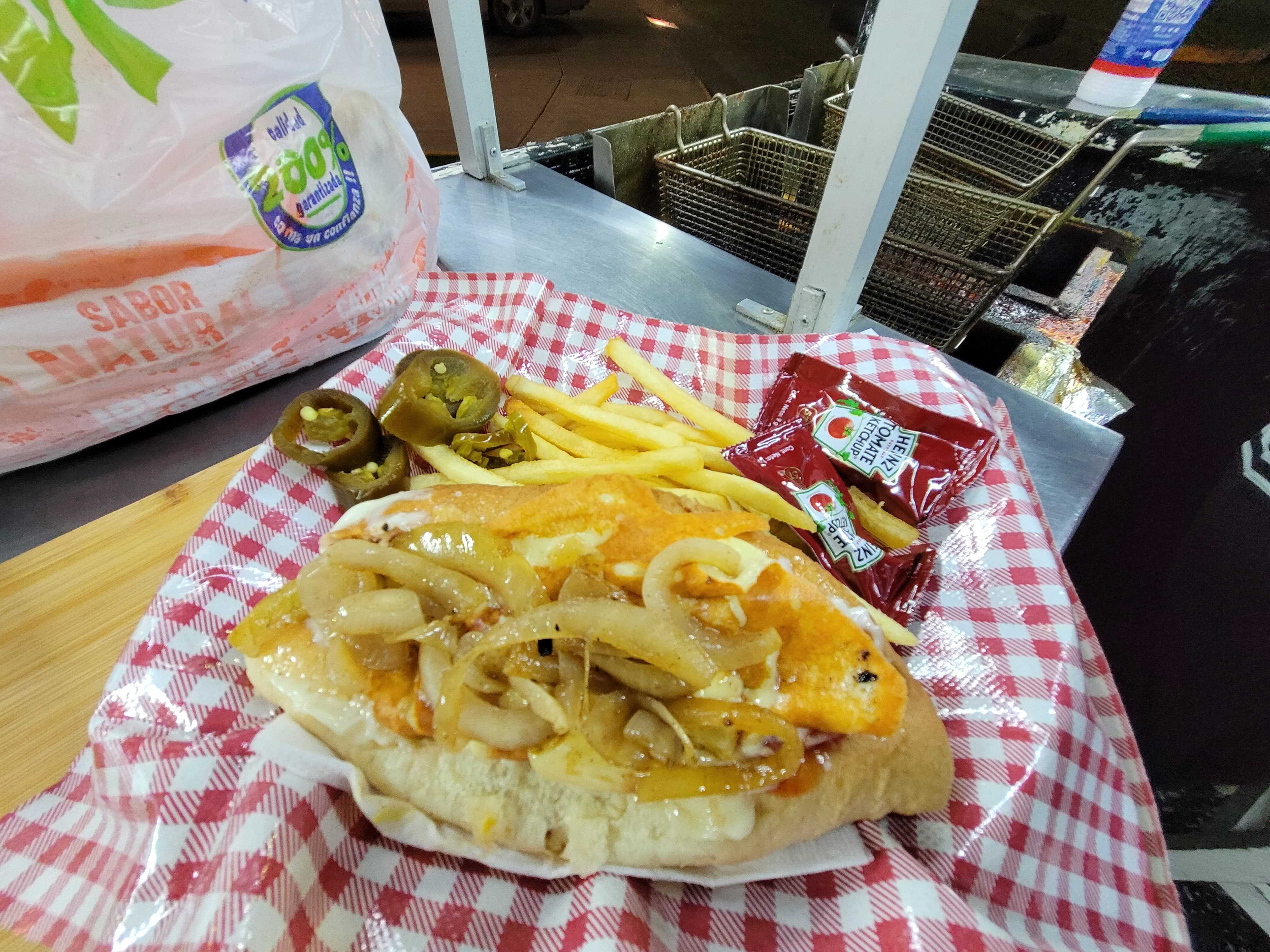 Salchicha de pavo envuelta en tocino, cebolla blanca, cebolla asada, tomate, mayonesa, mostaza y cátsup. Incluye papas.
