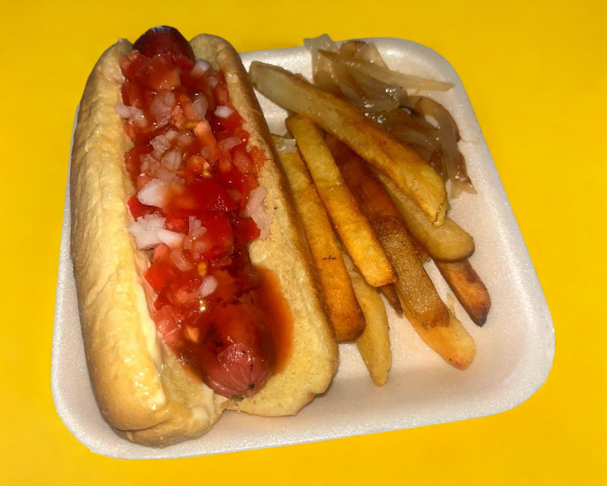 Salchicha,pan,tomate,cebolla asada,catsup,mayonesa,con papas ala francesa