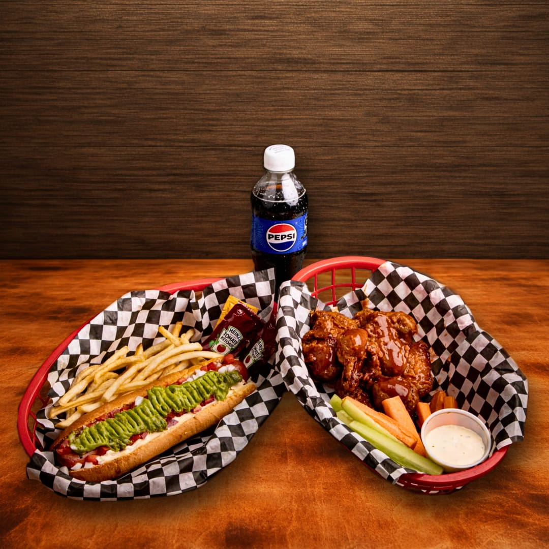 Hot dog jumbo de salchicha de res acompañado con alitas de pollo(12-15 piezas) incluye un refresco de 400 ml