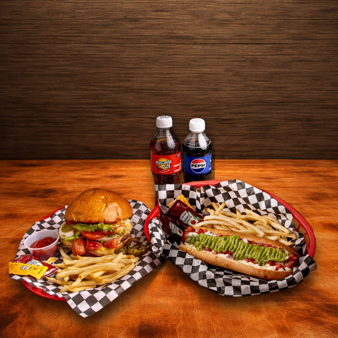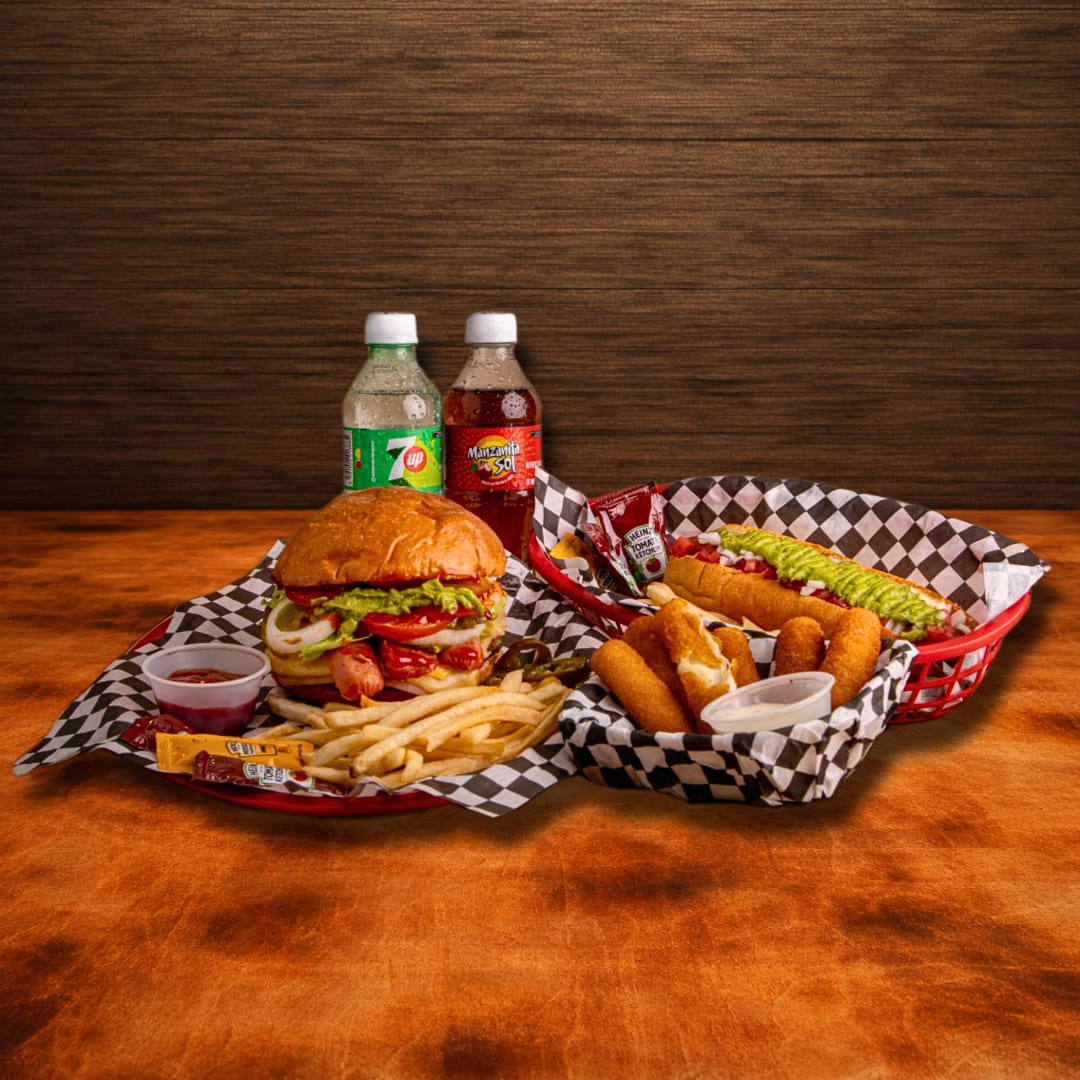 Hamburguesa especial mas hot dog jumbo de salchicha de res. Acompañamiento a elegir entre NUGGETS de pollo oh dedos de queso mozzarella. Incluye dos refrescos de 400 ml