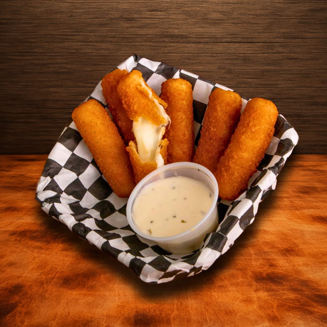 Dedos de queso mozzarella sazonados con especias italianas. Acompañados con aderezo ranch y papas a la francesa.