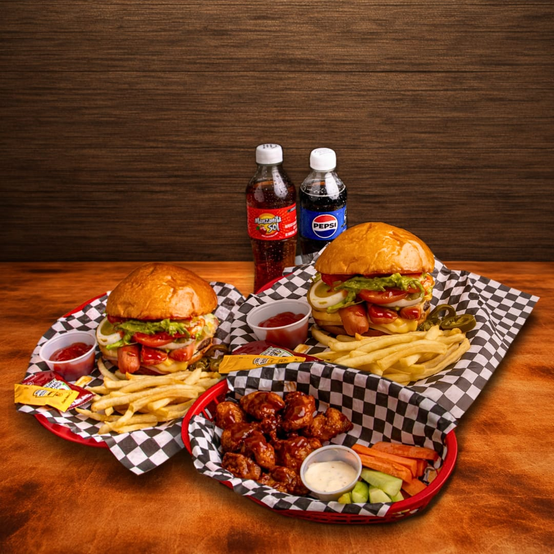 Dos hamburguesas especiales mas una orden de boneless con tu salsa a elegir. Incluye dos bebidas de 400 ml