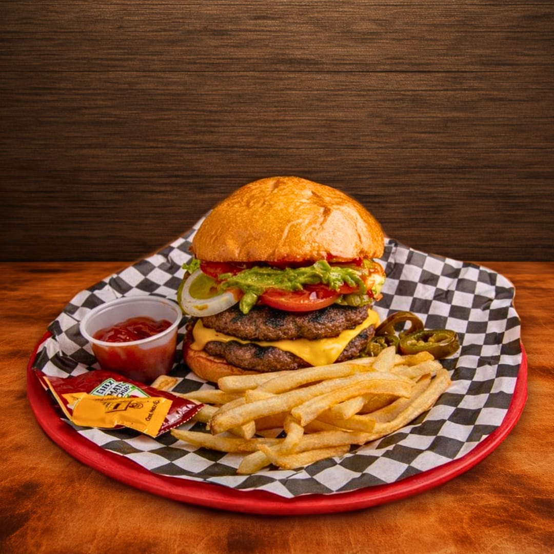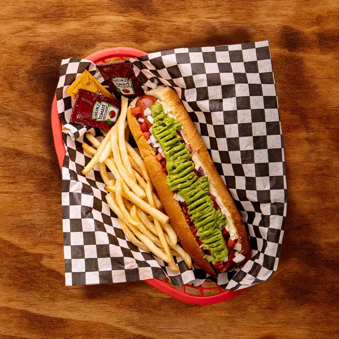 Salchicha jumbo de res, pan brioche recien horneado, tomate, cebolla y guacamole. Acompañado con papas a la francesa