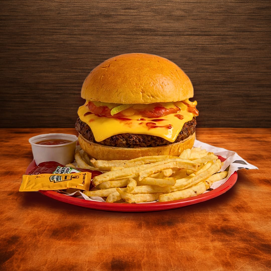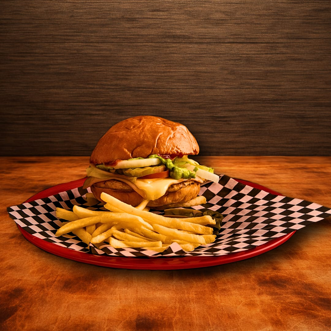 Carne ahumada y piña a la plancha. Jamón, queso gouda, queso americano, vegetales frescos, cebolla asada. Acompañada con papas a la francesa.