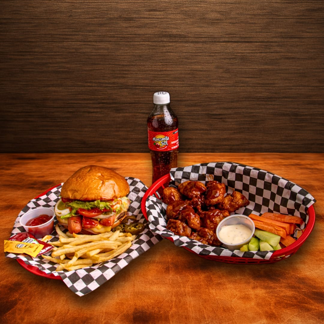Hamburguesa especial mas orden de boneless (12-15) piezas con tu salsa favorita. Incluye un refresco de 400 ml