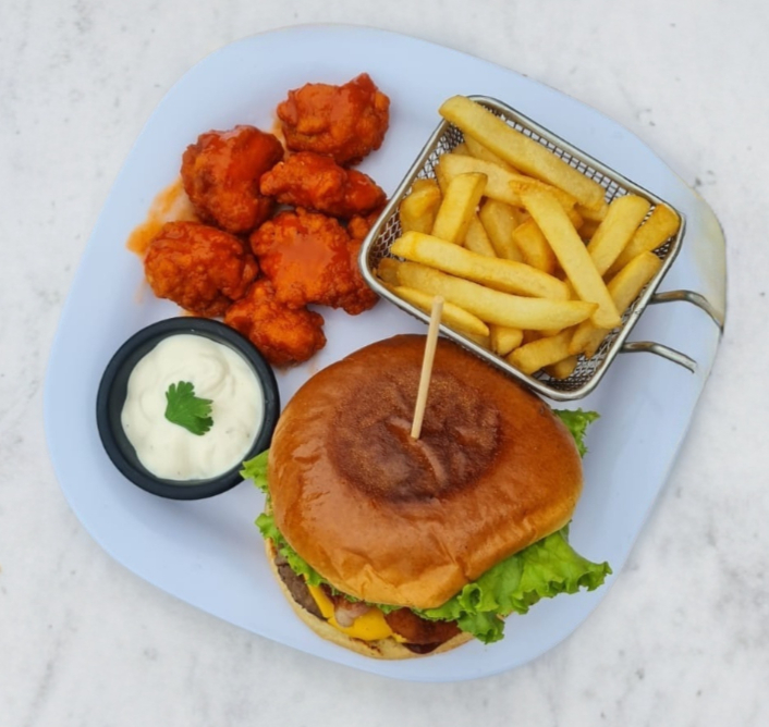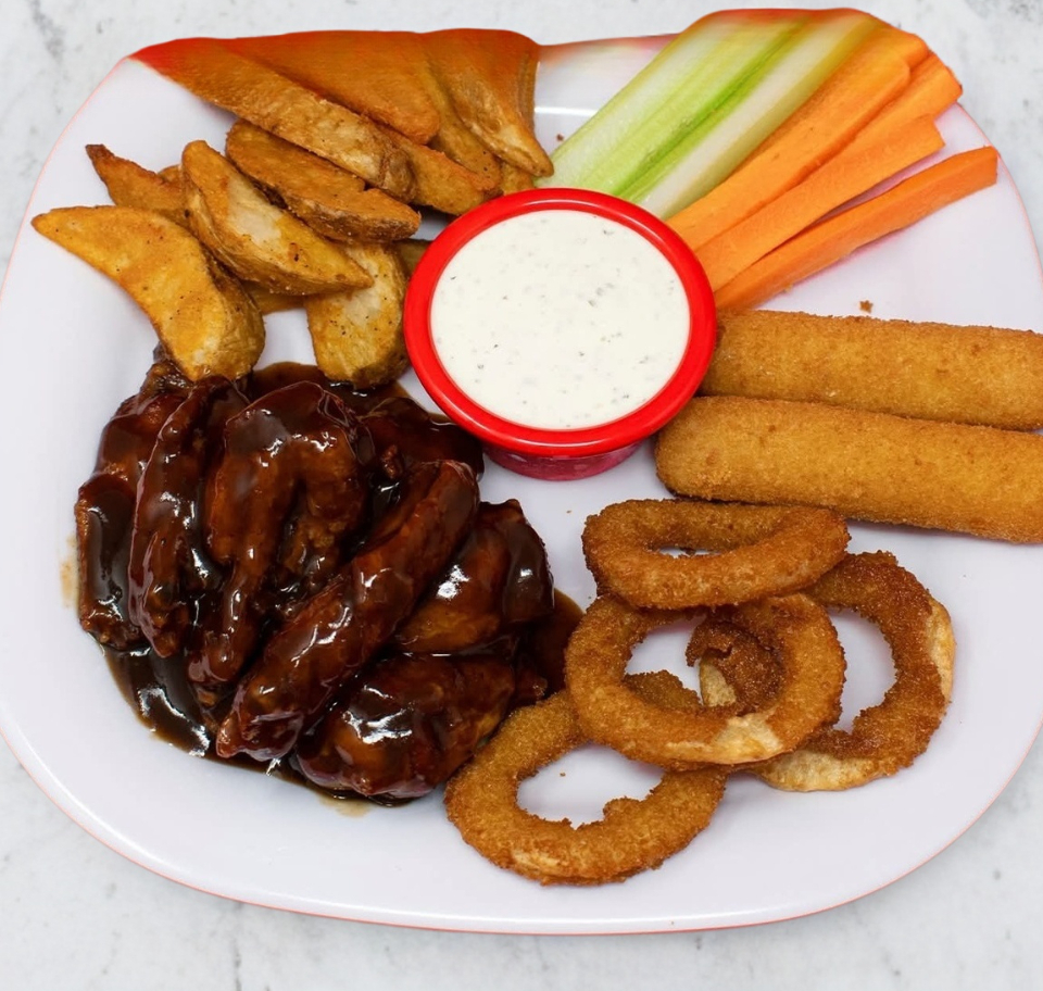 220 g De boneless, 4 aros de cebolla, 2 dedos de queso acompañado de papas francesas o gajo, vegetales y aderezo ranch.
