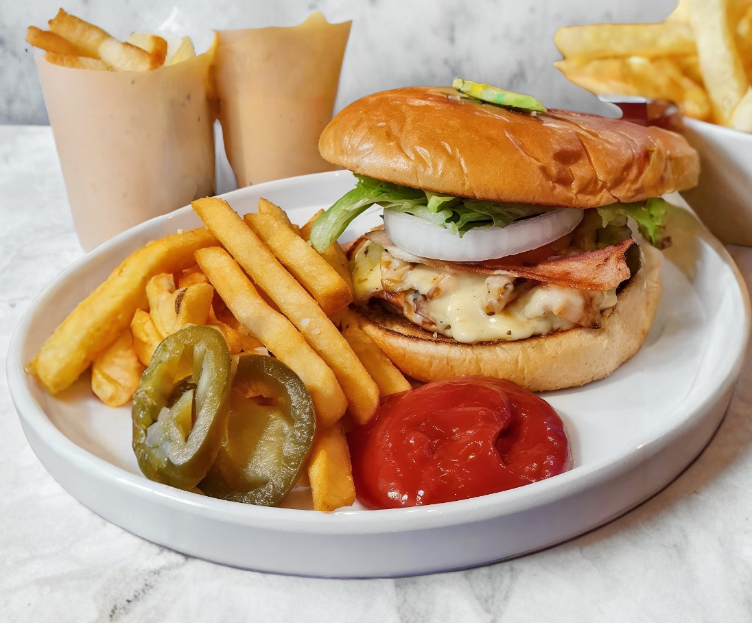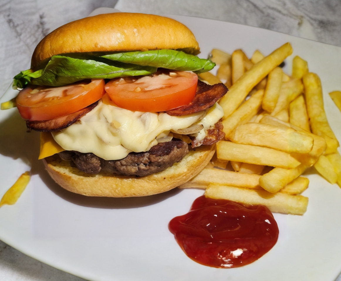 Pan brioche, carne de sirlon, queso americano, cebolla asada, tocino frito, queso manchego fundido, tomate y lechuga. Acompañada de papas francesas.