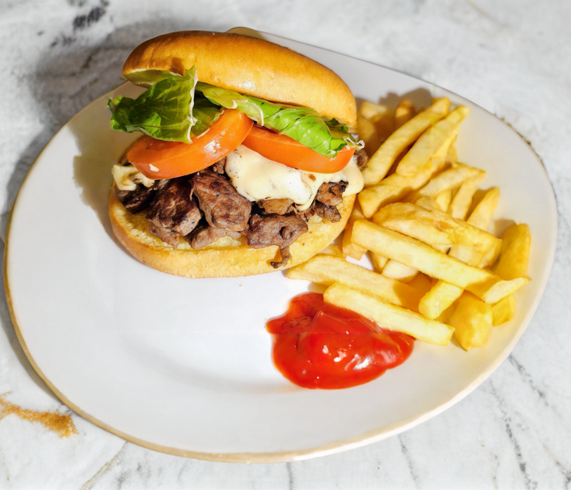 Pan brioche, 100 gramos de arrachera a la plancha con queso manchego fundido, tomate, cebolla y lechuga. Acompañada de papas a la francesa.