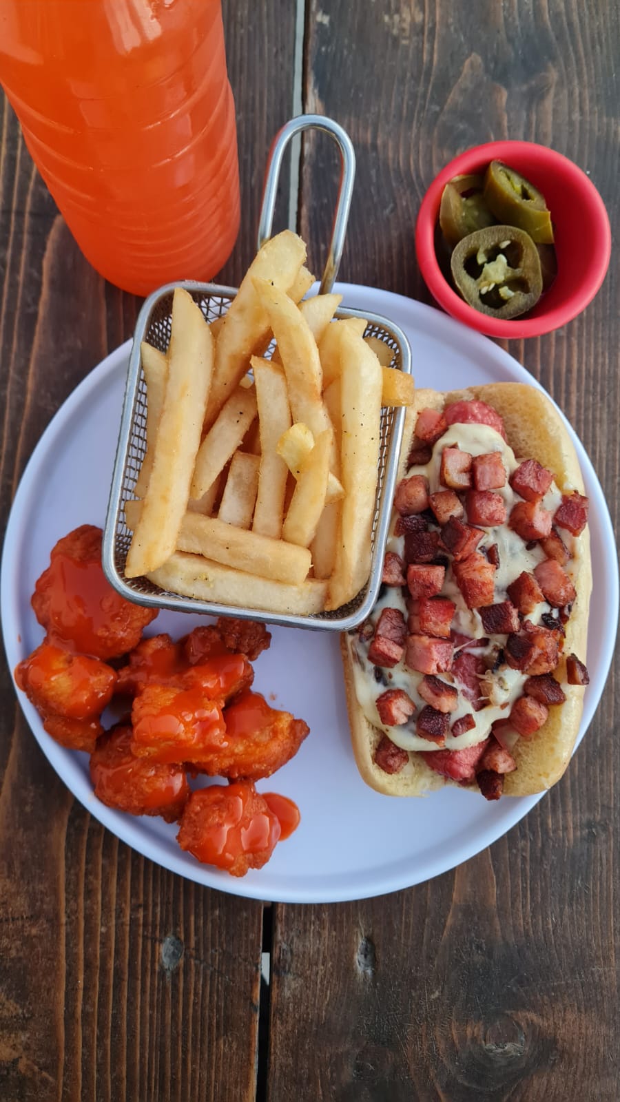 Hot dog especial, boneless, papas francesas y agua de sabor.