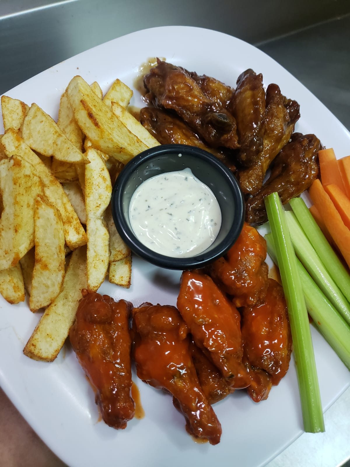 Alitas bañadas en salsa acompañadas de papas francesas ranch y vegetales 20 pzas.