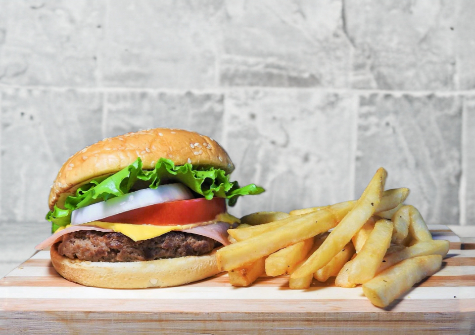 Pan brioche, milanesa de sirlon, queso americano, cebolla, tomate, lechuga, acompañada de papas francesas.