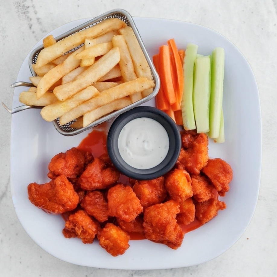 250 g De boneless bañados en tu salsa de preferencia acompañados de papas francesas ranch y vegetales.