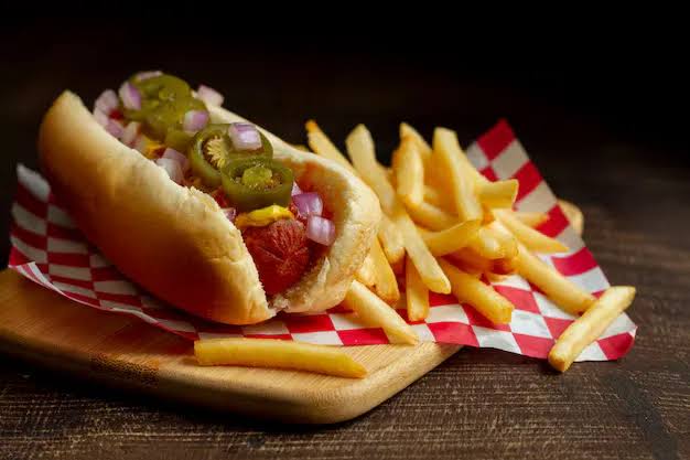 Salchicha, tocineta, cebolla, tomate, mayonesa, acompañado de papas a la francesa.