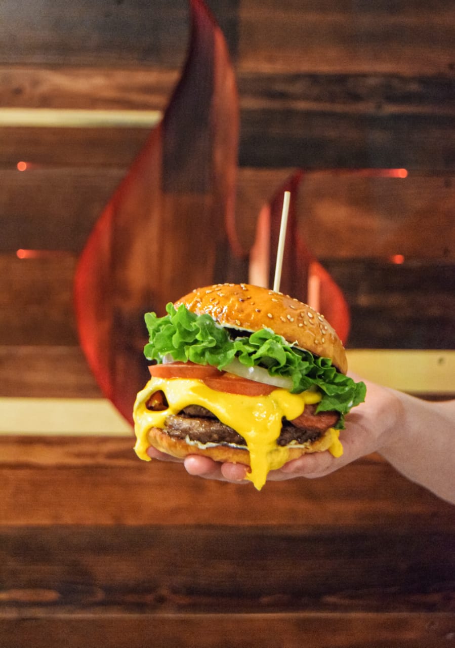 Pan brioche de base, un cuadro de queso empanizado, dos carnes de sirlon, queso americano, mezcla de cebolla asada, tocino, queso fundido, tomate y lechuga, acompañada de papas a la francesa.