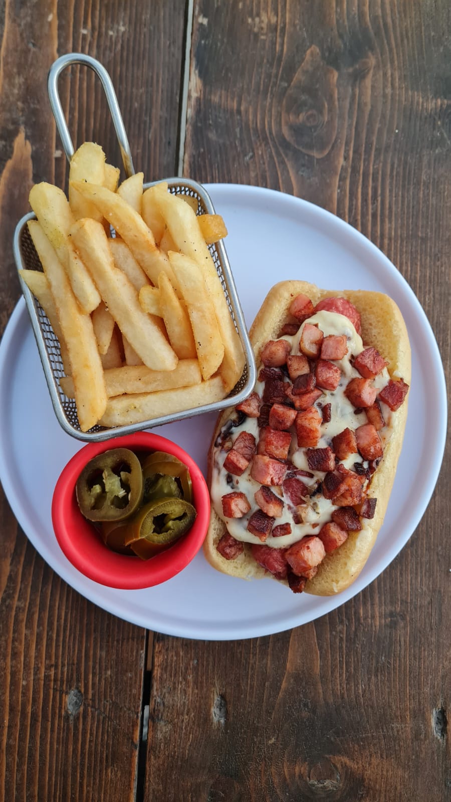 Salchicha, jamón, queso americano, tomate, mayonesa con topping de cebolla asada, queso fundido, tocino frito, acompañado de papas a la francesa.