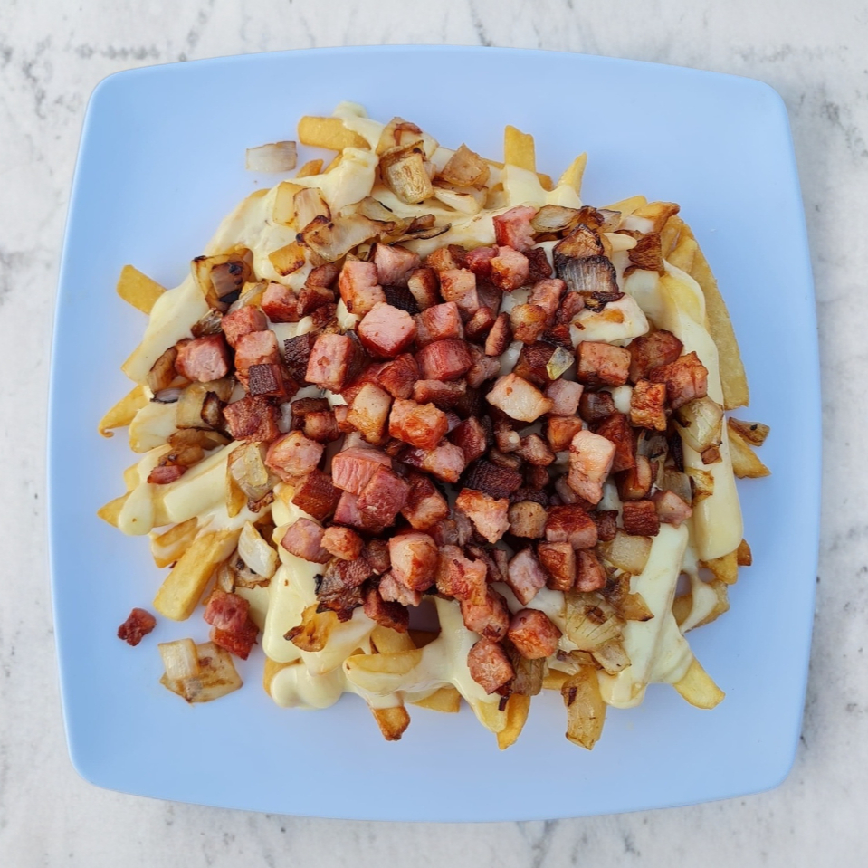 Papas francesas queso fundido cebolla asada y tocino en cubos.