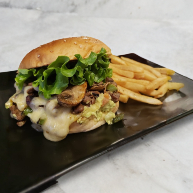 Pan brioche, base de guacamole especial, 100 g de arrachera a la plancha con queso fundido, mezcla de champiñones, chiles, jalapeños con queso fundido, tomate, cebolla y lechuga, acompañada de papas francesas.